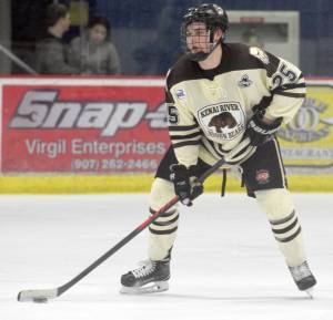 Kenai River Brown Bears defenseman Preston Weeks controls the puck last season at the Soldotna Regional Sports Complex. Weeks has been named captain of this year’s team. (Photo by Jeff Helminiak/Peninsula Clarion)