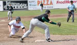 Photo by Jeff Helminiak/Peninsula Clarion Kenai's Sam Combs is tagged out trying to steal third base in the second inning by Colony's Zachary Satterly on Thursday at the Southcentral Conference tournament at Coral Seymour Memorial Park in Kenai.