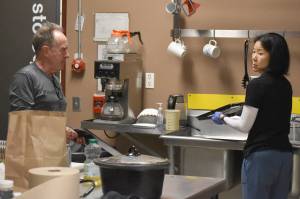 John Bryan and Candace Nakagawa, Co-Directors of Sports Science, Strength and Conditioning, clean up the kitchen after preparing a meal for the Kenai River Brown Bears at the Soldotna Regional Sports Complex in Soldotna, Alaska, on Friday, March 29, 2024. (Photo by Jeff Helminiak/Peninsula Clarion)