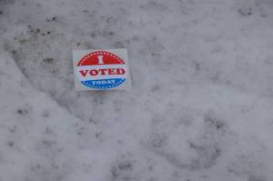 An “I voted” sticker lays abandoned outside Soldotna City Hall during the special Field House election on March 5, 2019. (Photo by Brian Mazurek/Peninsula Clarion)
