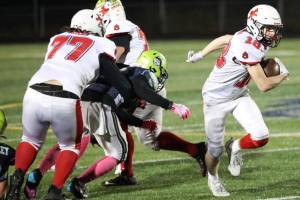 Kenai's Aasen Campanella breaks free for a gain during a playoff win over Redington on Saturday, Oct. 12, 2024, at Redington Jr/Sr High School in Wasilla, Alaska. (Bruce Eggleston/matsusports.net)