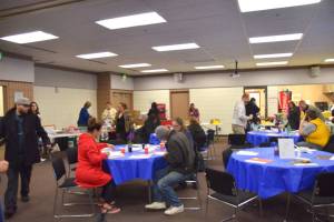 Volunteers and clients enjoy hot meals together during Project Homeless Connect at the Soldotna Regional Sports Complex on Wednesday, Jan. 23, 2019. (Photo by Brian Mazurek/Peninsula Clarion)