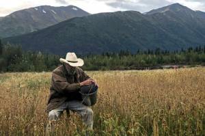 Robert Gibson of Cooper Landing picks barley by hand at a small barley field planted by the Kenai Peninsula Borough in a vacant gravel pit on Friday, Aug. 31, 2018, in Cooper Landing, Alaska. Gibson uses three different methods to pick the barley, including using a scythe and a hand sickle. (Photo by Victoria Petersen/Peninsula Clarion)