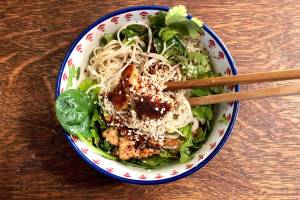 Salmon, greens and an assortment of spices are combined with noodles to make a creative pasta bowl. (Photo by Victoria Petersen/Peninsula Clarion)