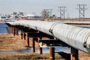 In this 2007 file photo, an oil transit pipeline runs across the tundra to flow station at the Prudhoe Bay oil field on Alaska’s North Slope. (AP Photo/Al Grillo, File)
