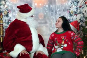 Santa Claus greets Gemma Germann during Christmas Comes to Kenai at the Kenai Chamber of Commerce and Visitor Center in Kenai, Alaska, on Friday, Nov. 29, 2024. (Jake Dye/Peninsula Clarion)