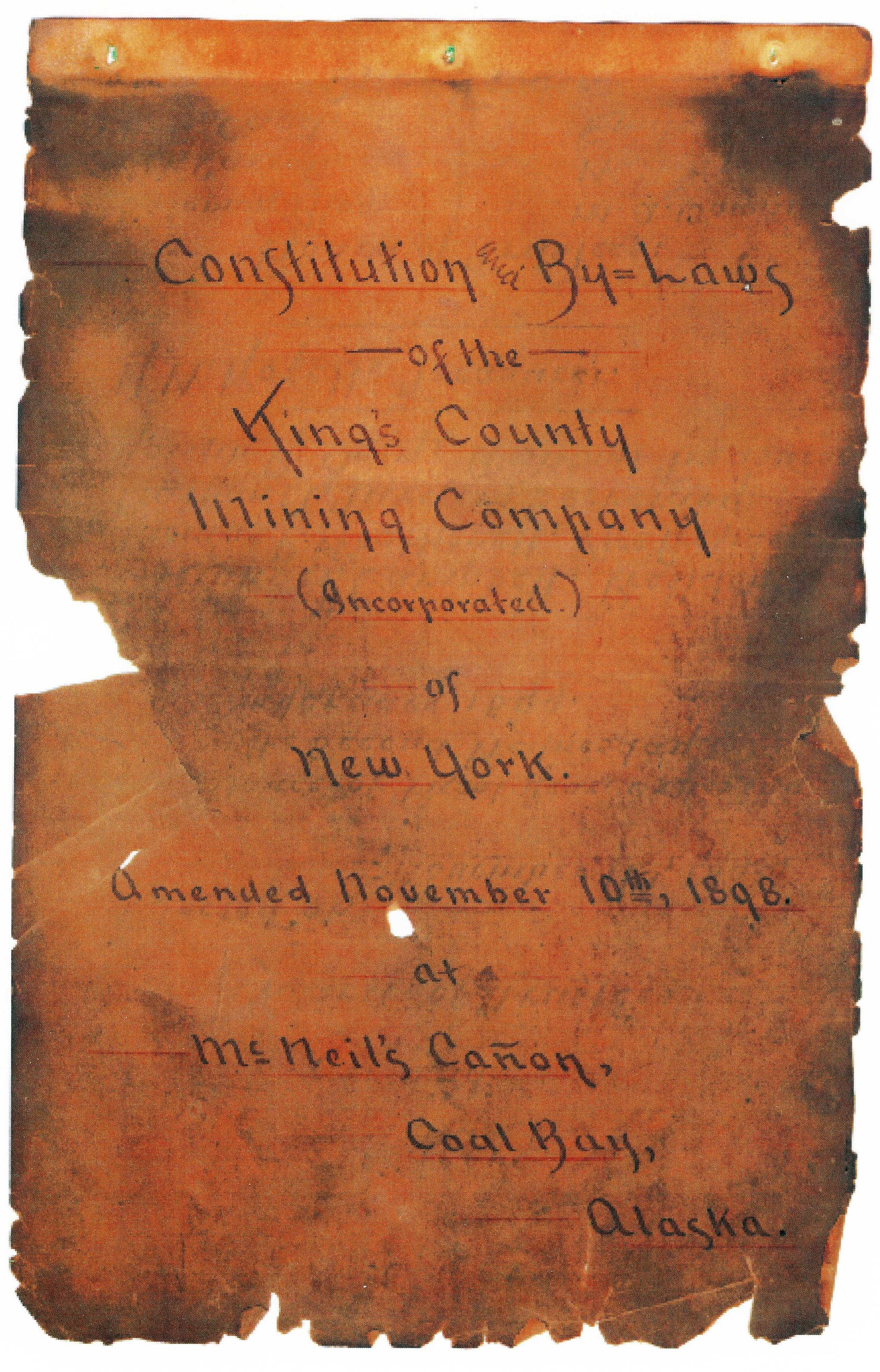 In the City Hall lobby in Homer is a small section of one wall dedicated to local history. In a small frame on that wall is an orange-brown photocopy of a document cover more than a century old and titled “Constitution and By-Laws of the Kings County Mining Company of New York.” The story behind that document and its connection to Homer and the central Kenai Peninsula requires a step back in time and across the North American continent.