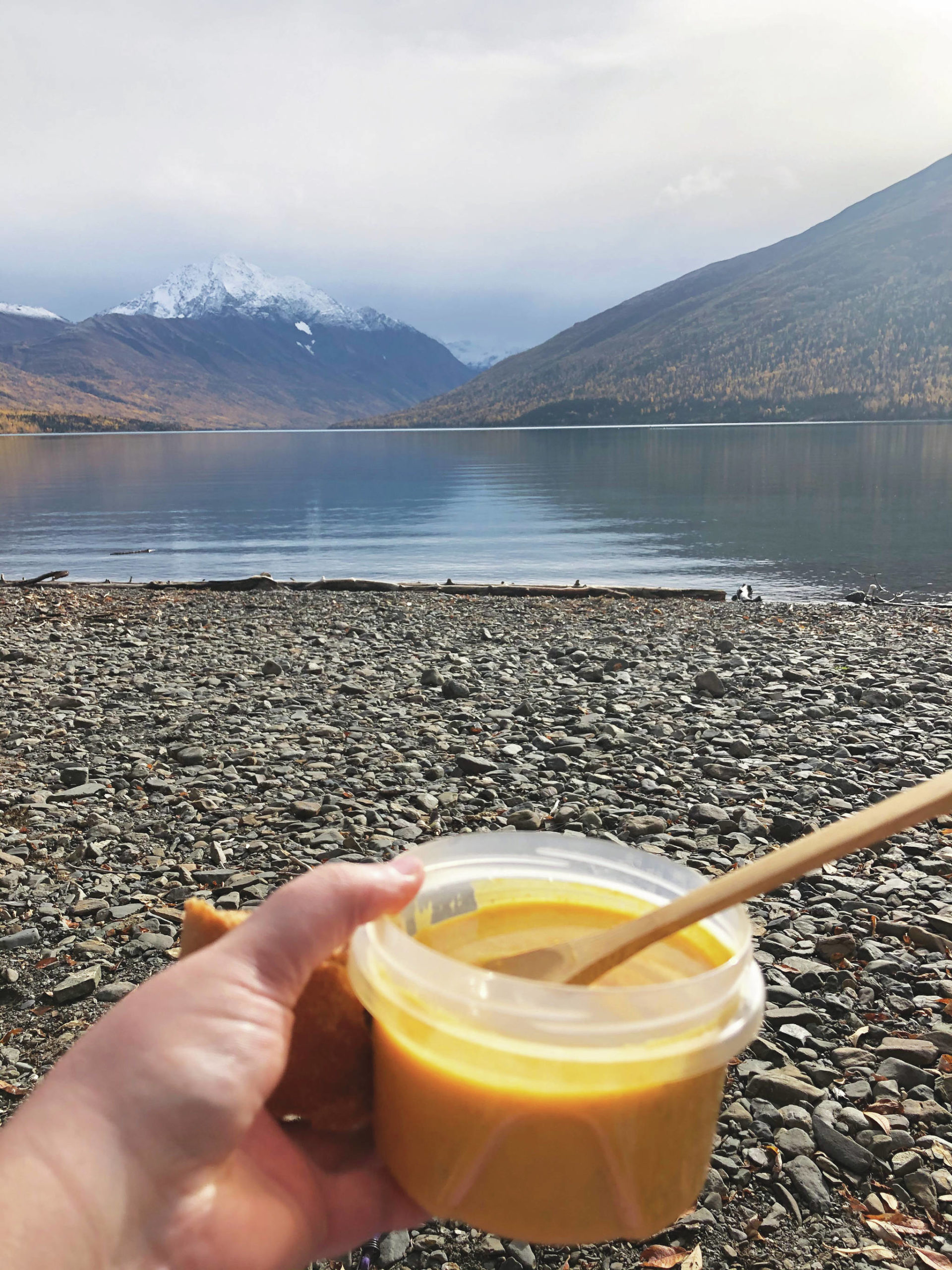 My boyfriend and I spent our Sunday driving to Eklutna Lake, where the turquoise blue waters are the perfect contrast to the quickly changing gold and yellow leaves of the aspen and birch trees. We laid down a picnic blanket on the rocky shores of the glacier lake and set up our picnic. We brought a hot thermos full of comforting butternut squash soup and a hunk of bread.