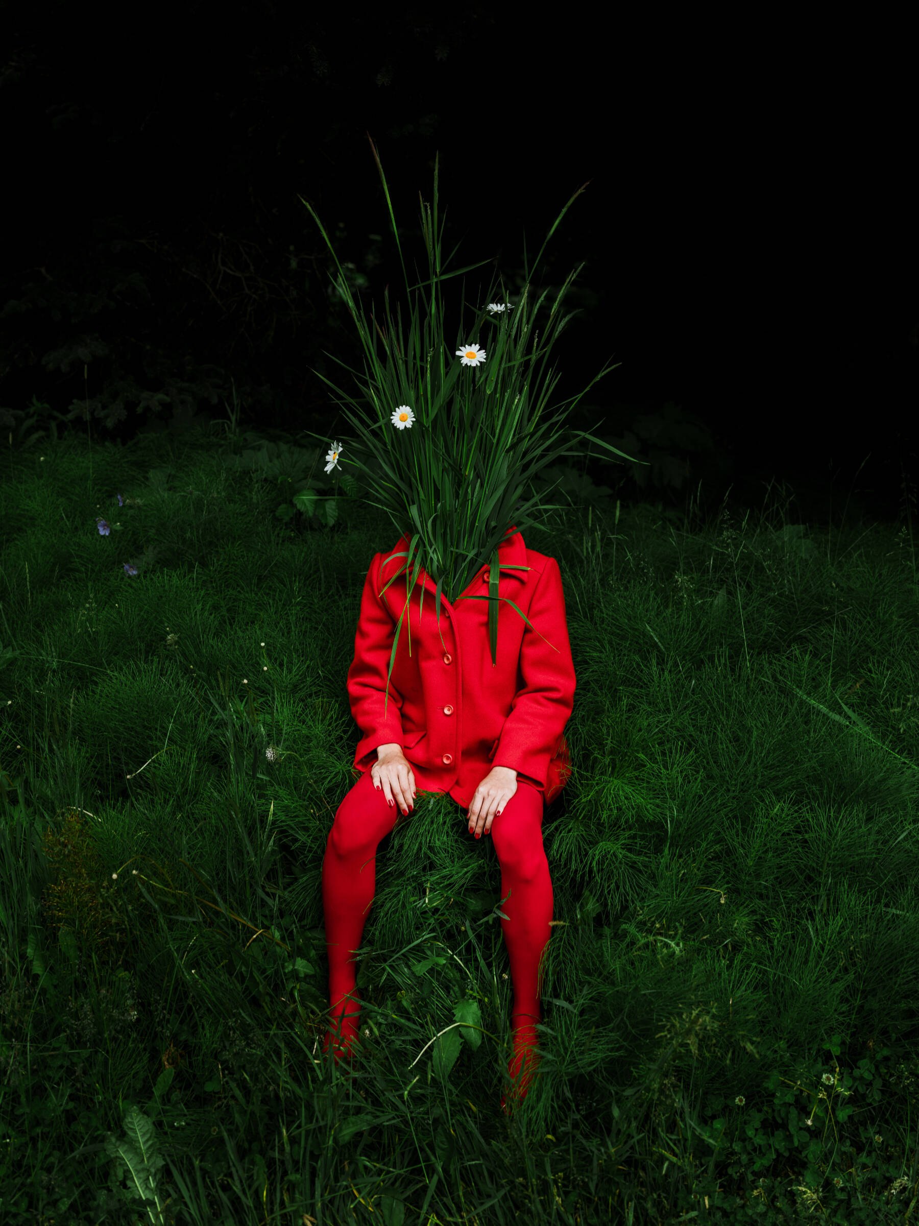 In her image, “I Think I’m Growing,” a woman wearing a red jacket, red skirt and red tights sits poised on and surrounded by a field of grass, with tall stalks of greenery and a scattering of daisies jutting out from her top in place of her neck and head. Modeled by community member Kristen Steimer, this piece was inspired after Crain had a particularly powerful year of personal growth.
