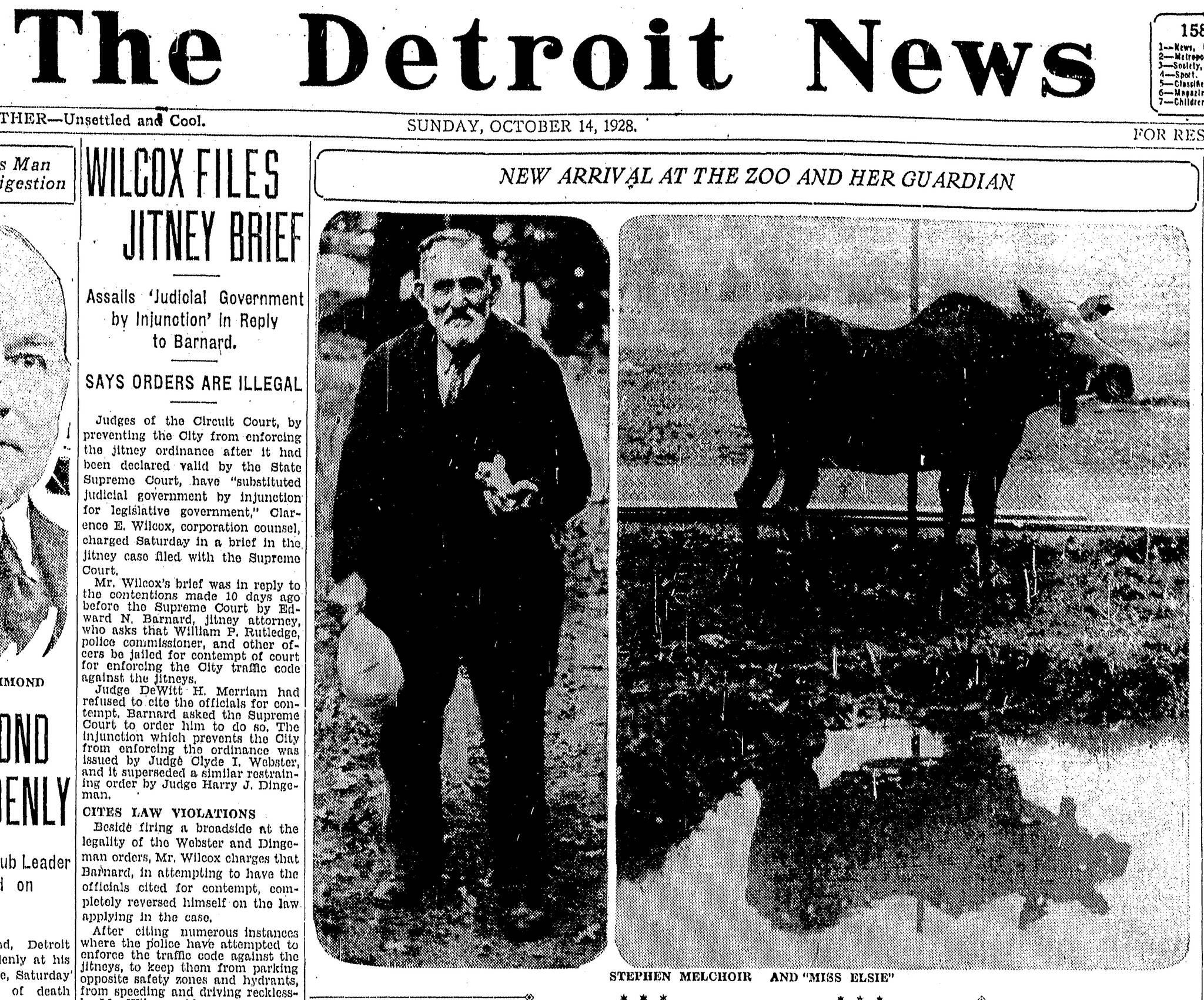The Detroit News placed a photo of Melchior and a separate image of Elsie on the front page of its Oct. 14 edition. An accompanying story related the chaotic greeting Elsie received from the two resident moose and Melchior’s assurances that, despite appearances, the three moose would soon become friends.