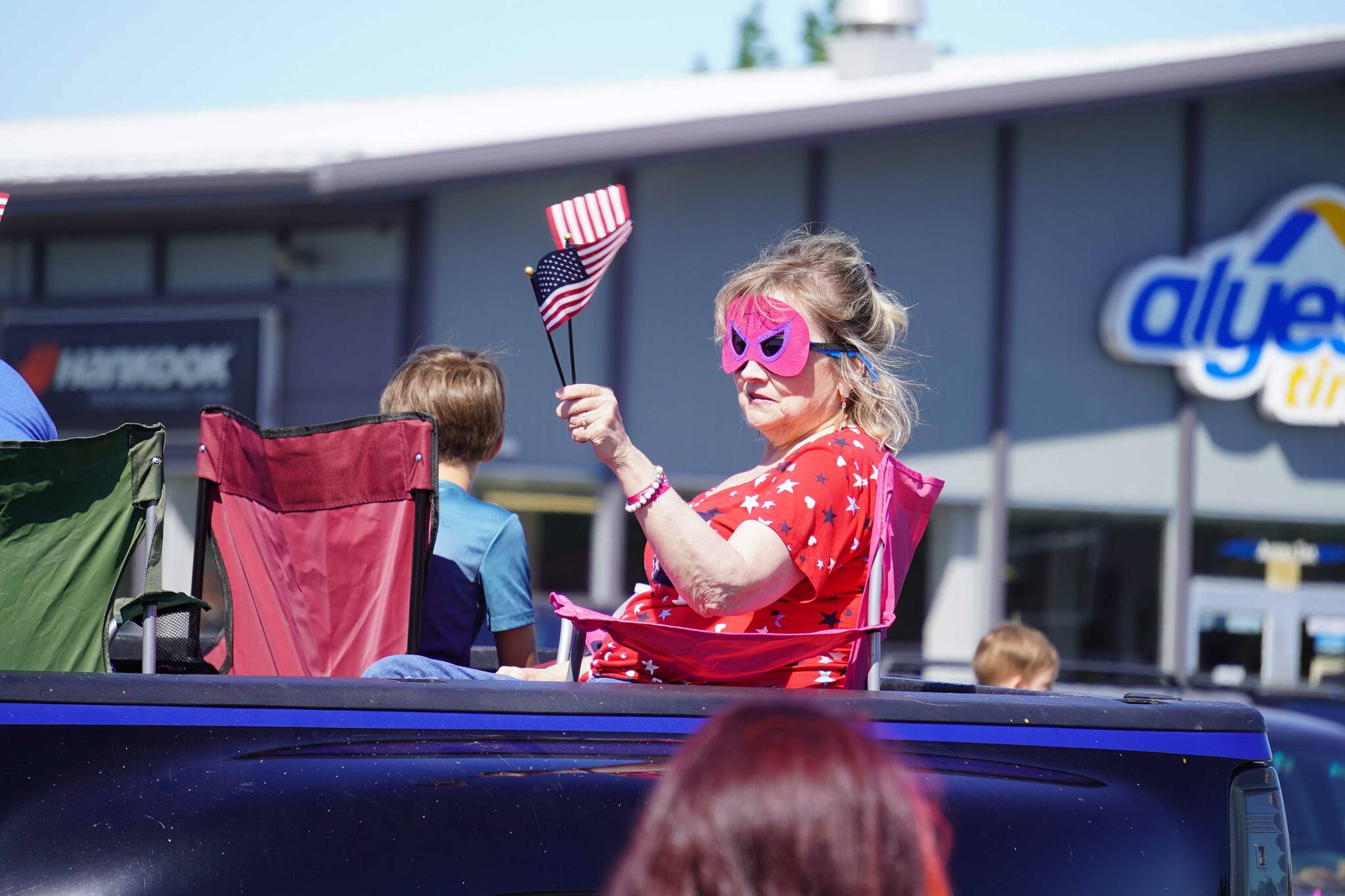 A masked woman waves a small American flag during a Fourth of July parade on South Willow Street in Kenai, Alaska, on July 4, 2025. (Photo courtesy Sarah Every)