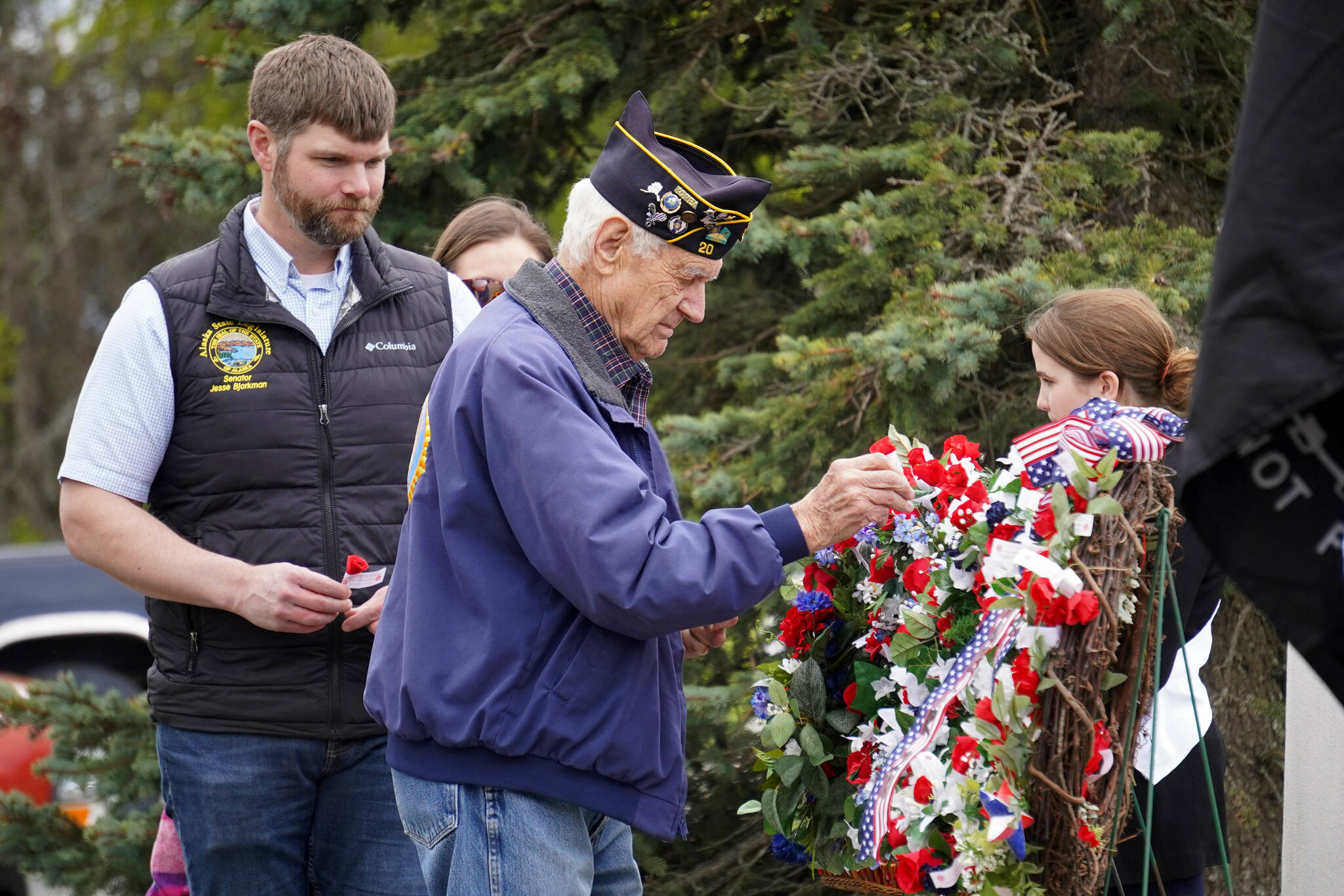 During a somber procession, community members offered poppies for fallen soldiers at a Memorial Day service held Monday at Leif Hanson Memorial Park.