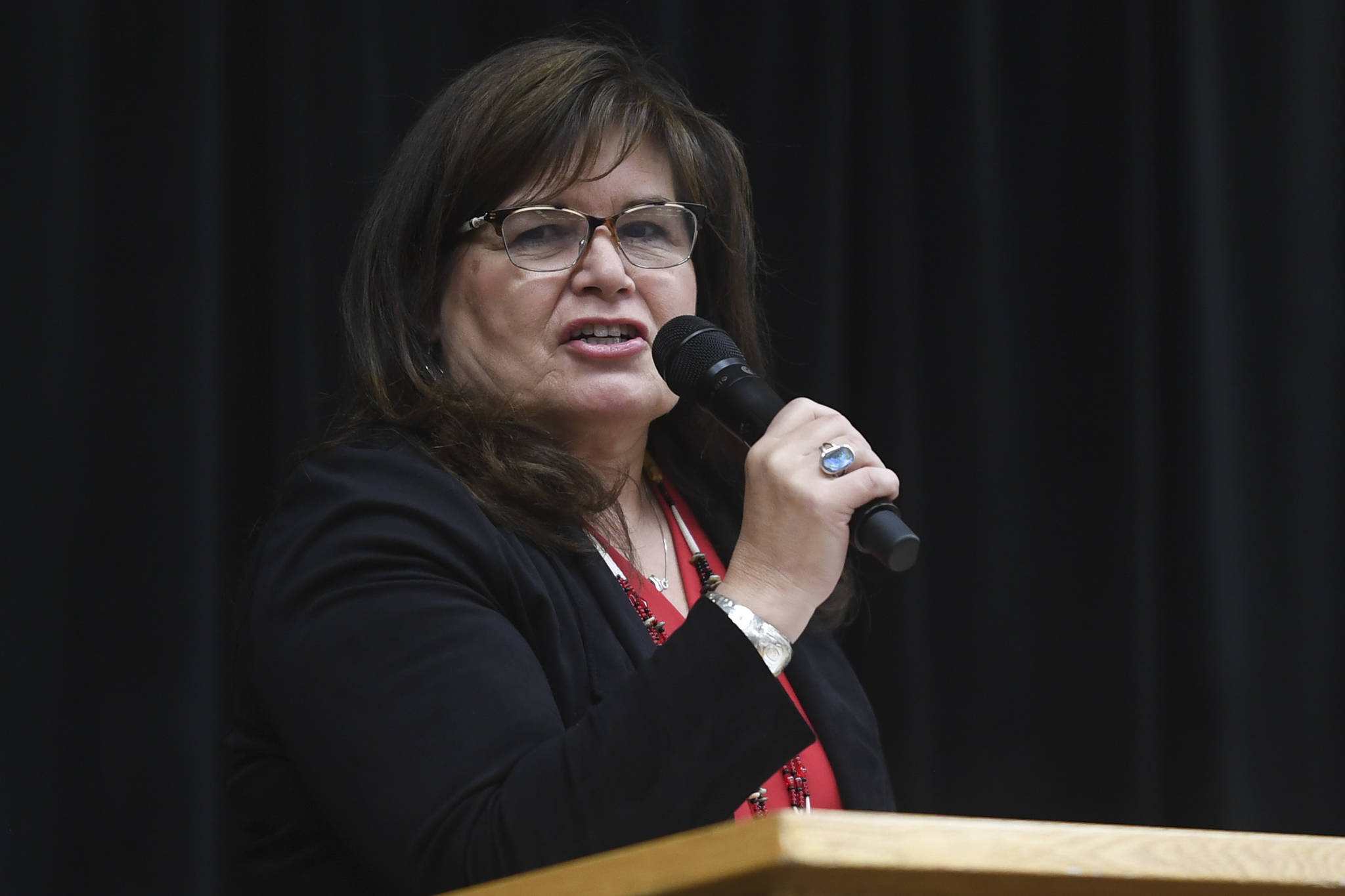 Jackie Pata, President and CEO of the Tlingit-Haida Regional Housing Authority, speaks during Indigenous Peoples’ Day at the Elizabeth Peratrovich Hall on Monday, Oct. 14, 2019. (Michael Penn | Juneau Empire)
