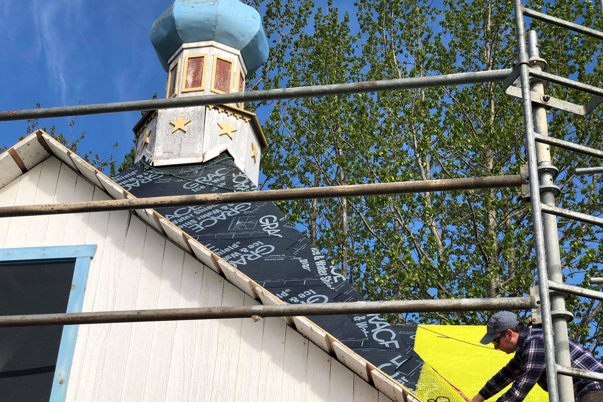 At the beginning of the month, restoration experts began patching up and waterproofing the roof of the iconic chapel in Kenai’s Old Town, which sits across the street from the Holy Assumption of the Virgin Mary Church.