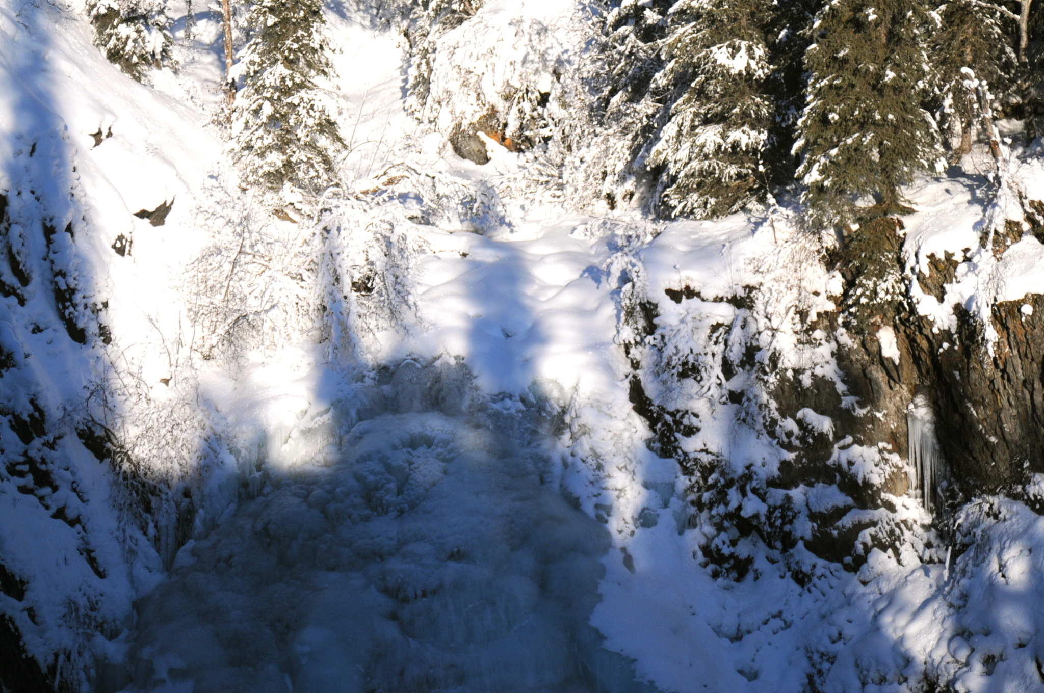 Trees cast their shadow on the frozen Juneau Falls about four miles up the Resurrection Pass Trail on Saturday, Feb. 4, 2017 near Cooper Landing, Alaska. (Elizabeth Earl/Peninsula Clarion)