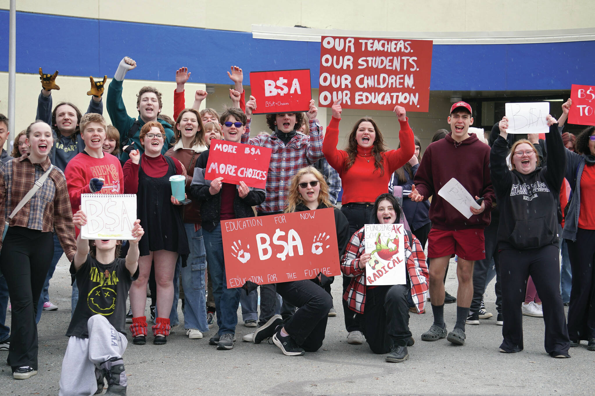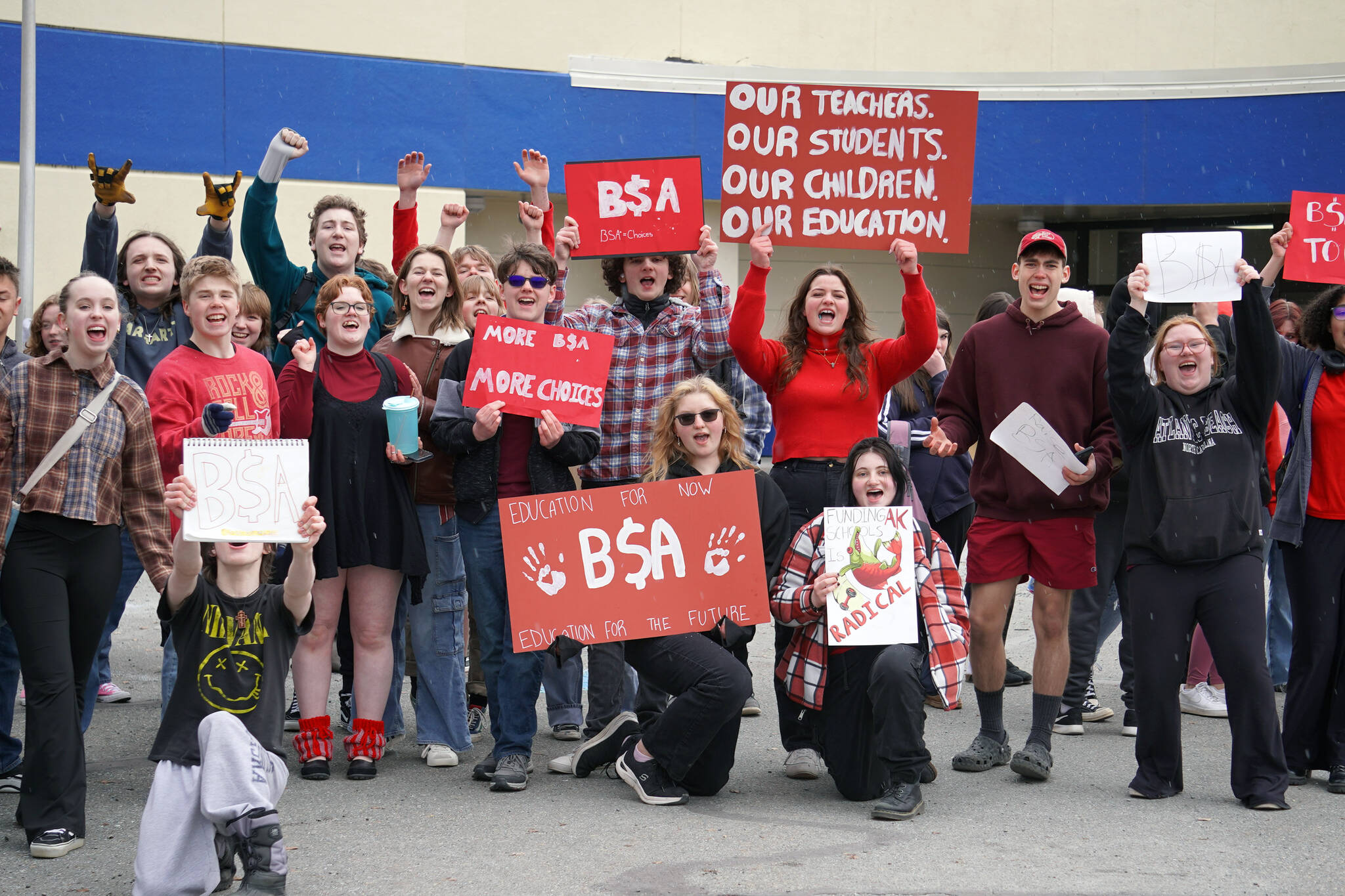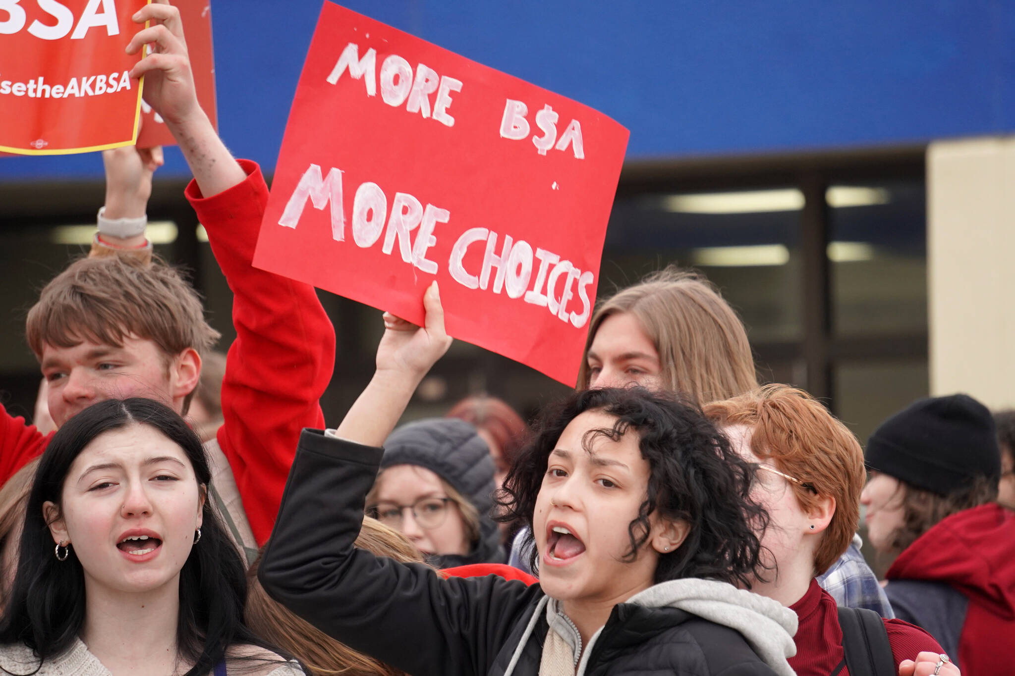 As students filled the space outside of the school, Webster led chants, encouraged her peers to take videos and photos, and told them to send those images — and their thoughts — to legislators. That goes especially, she said, for those who voted against overturning the veto, including Reps. Ben Carpenter, R-Nikiski, and Sarah Vance, R-Homer.
