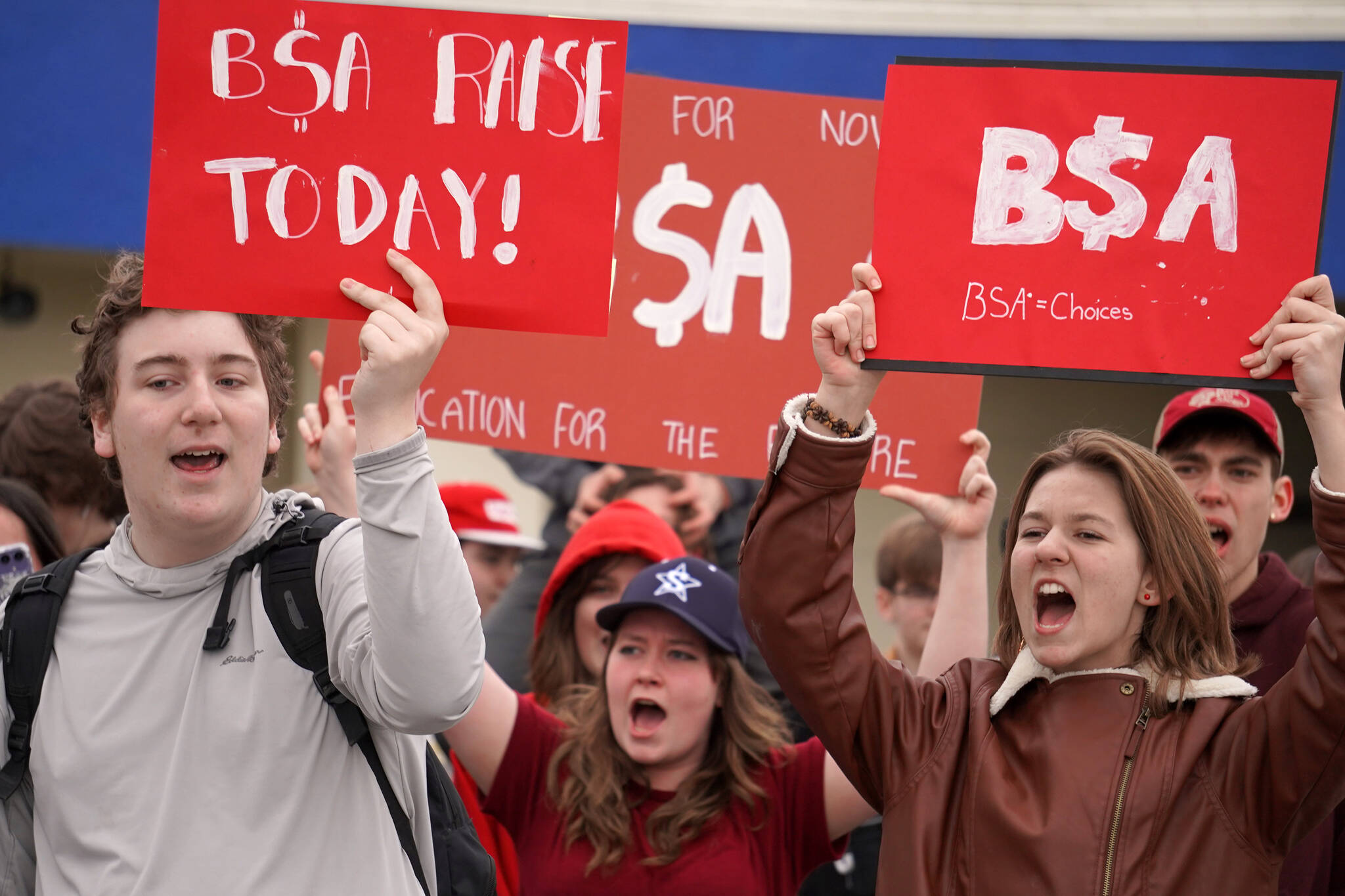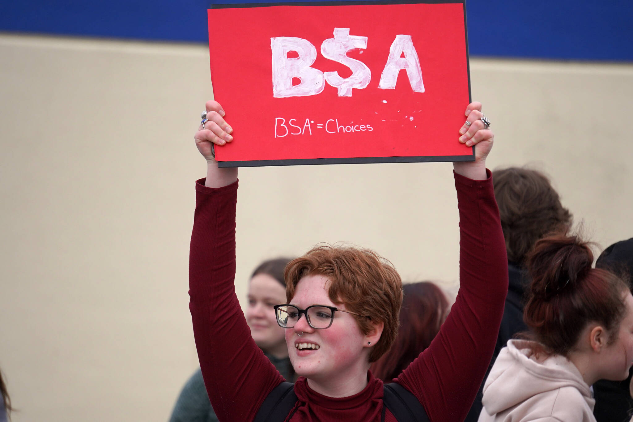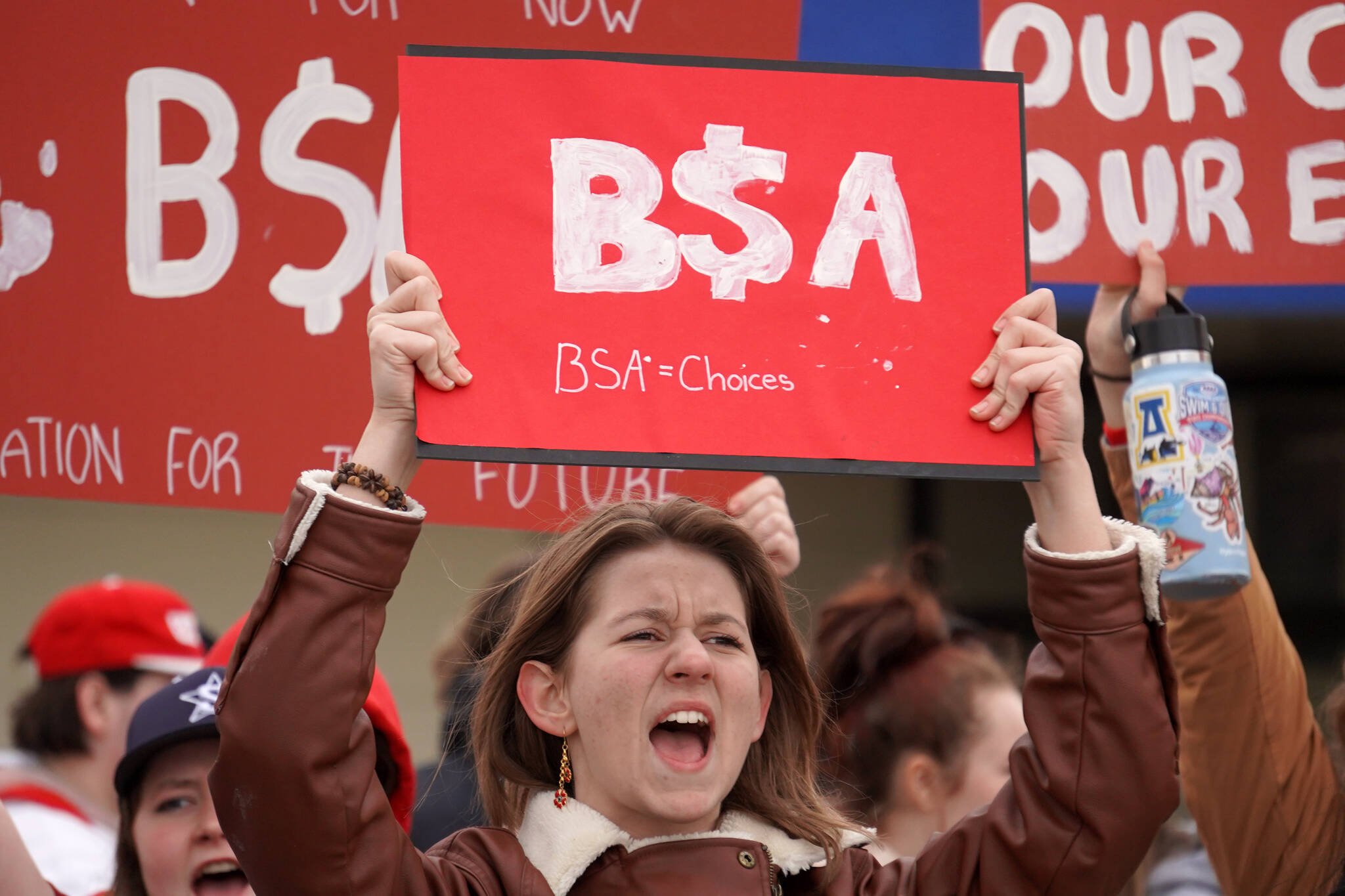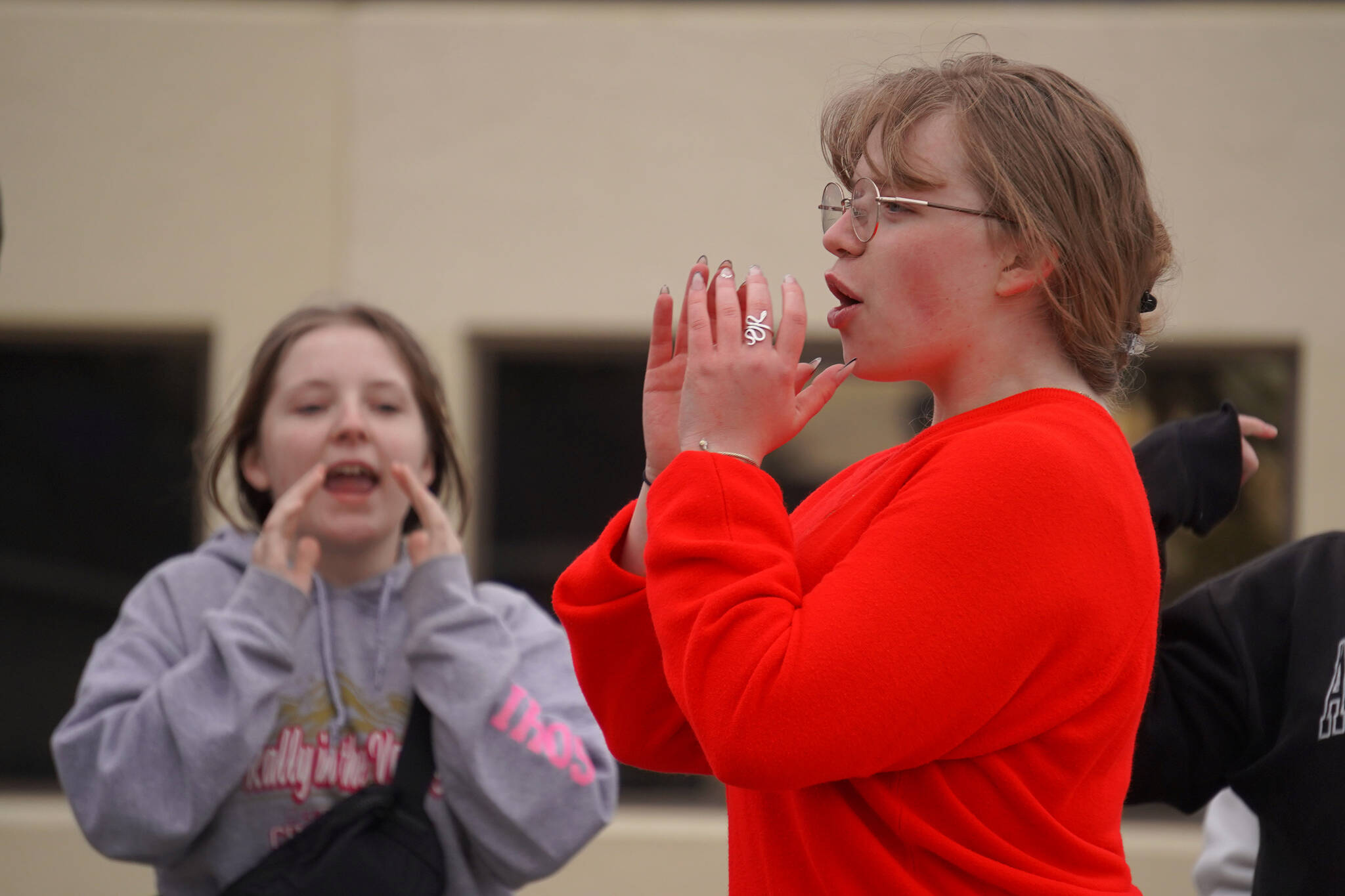 As students filled the space outside of the school, Webster led chants, encouraged her peers to take videos and photos, and told them to send those images — and their thoughts — to legislators. That goes especially, she said, for those who voted against overturning the veto, including Reps. Ben Carpenter, R-Nikiski, and Sarah Vance, R-Homer.