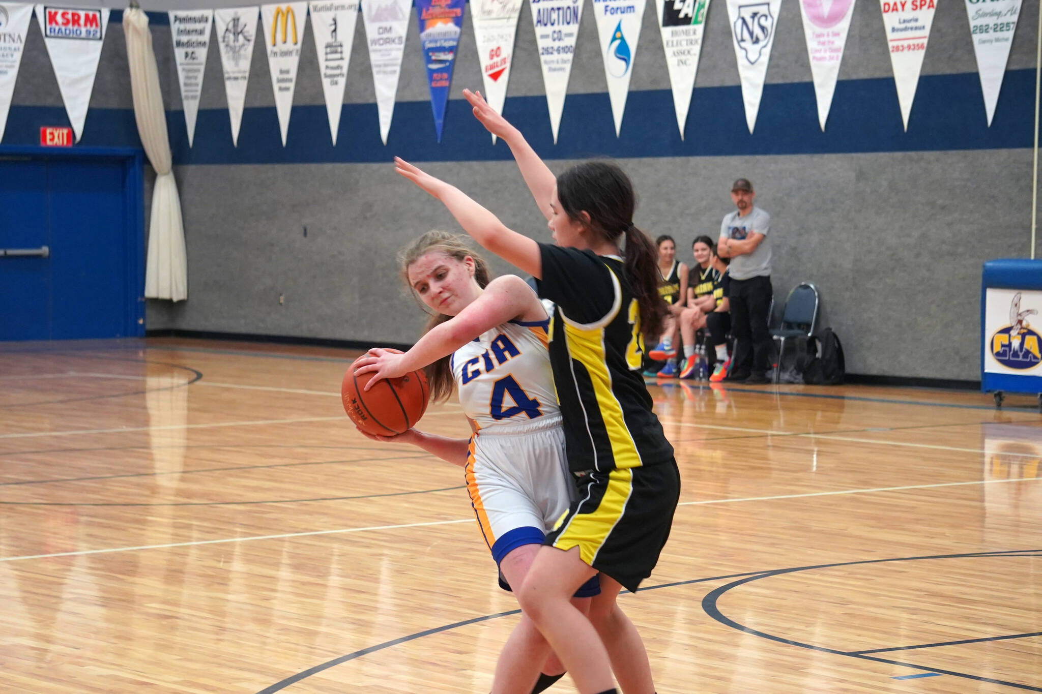Cook Inlet Academy’s Mackenzie Carson battles to maintain control of the ball despite blocking by Aniak’s Maddison Steeves during a basketball game at Cook Inlet Academy in Soldotna, Alaska, on Tuesday, Feb. 13, 2024. (Jake Dye/Peninsula Clarion)