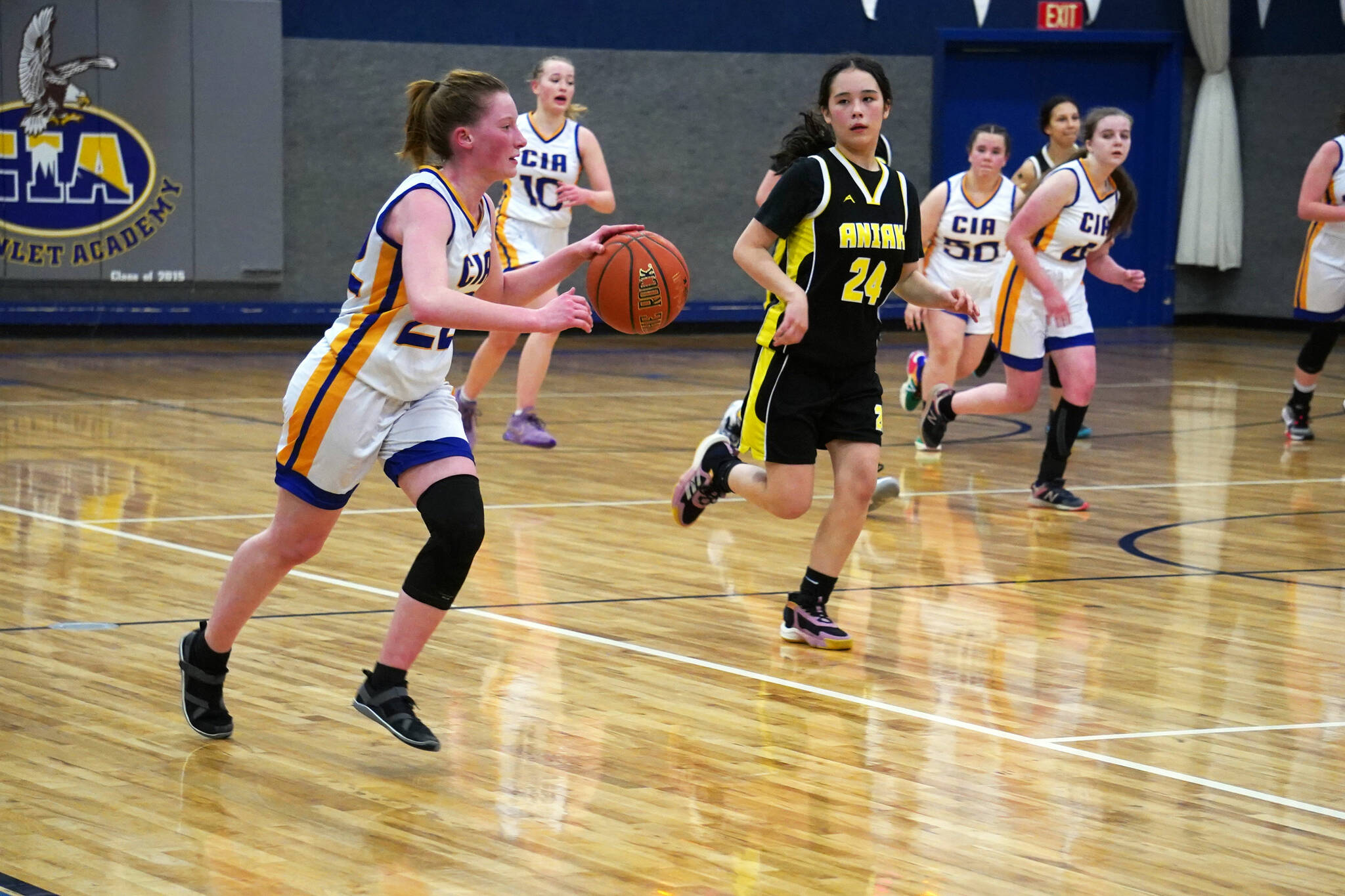 Cook Inlet Academy’s Rebekah Dillingham outpaces Aniak’s Maddison Steeves as she dribbles down the court during a basketball game at Cook Inlet Academy in Soldotna, Alaska, on Tuesday, Feb. 13, 2024. (Jake Dye/Peninsula Clarion)