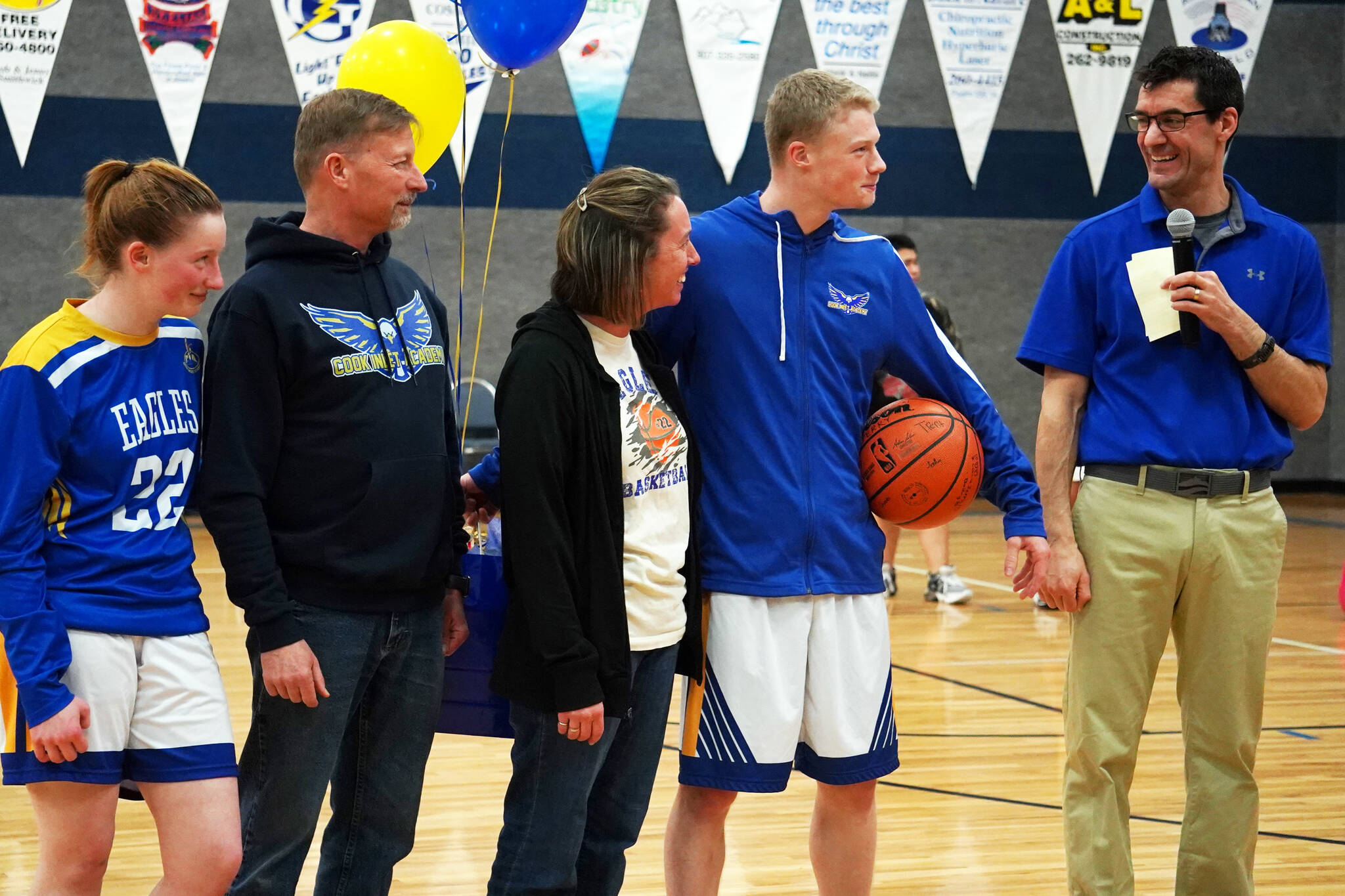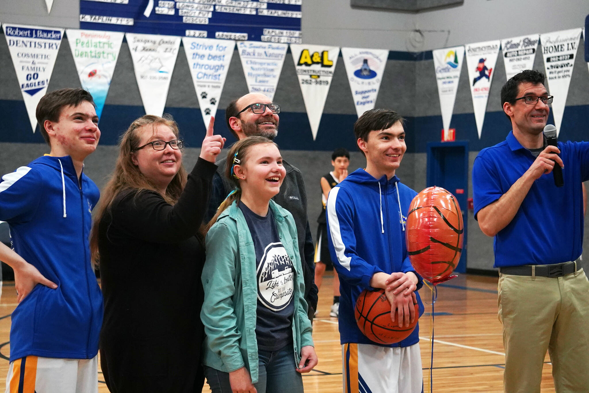 Cook Inlet Academy’s Jeremy Dillingham stands with his family and coach Ben McGarry as he’s honored during senior night festivities at Cook Inlet Academy in Soldotna, Alaska, on Tuesday, Feb. 13, 2024. (Jake Dye/Peninsula Clarion)