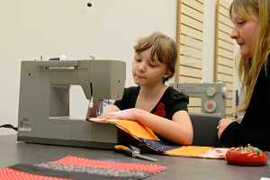 Clara Cozzini sews a quilt for a doll with help from librarian Ryanna Thurman at a meeting of…
