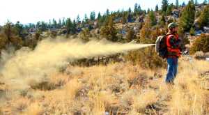 ADVANCE FOR THE WEEKEND OF MARCH 21-22 AND THEREAFTER - In an undated photo provided by BearSpray.com, Tim Lynch sprays the Bear Attack Pack backwards out of a backpack in a demonstration. The canister can be discharged much like pulling the ripcord on a parachute. The pack fits any size can of bear spray. (AP Photo/courtesy of BearSpray.com)