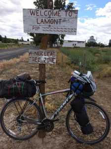 Photo courtesy Tyler Peek Nikiksi resident Tyler Peek takes a break in Lamont, Iowa during his bike trek accross the country through all the Lower 48 states, a distance of 6,850 miles.
