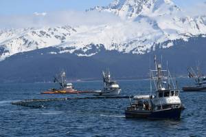 A fishing vessel fleet off the coast of Seward, Alaska, participates in oil spill response training hosted by the Prince William Sound Regional Citizens’ Advisory Council (RCAC), along with members of the Alyeska Pipeline Service Company, on Thursday, April 14, 2022. (Camille Botello/Peninsula Clarion)