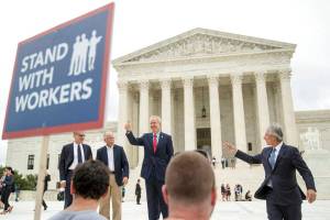 Illinois Gov. Bruce Rauner gives a thumbs up outside the Supreme Court, Wednesday, June 27, 2018 in Washington. From left are, Liberty Justice Center’s Director of Litigation Jacob Huebert, plaintiff Mark Janus, Rauner, and Liberty Justice Center founder and chairman John Tillman. The Supreme Court ruled that government workers can’t be forced to contribute to labor unions that represent them in collective bargaining, dealing a serious financial blow to organized labor. (AP Photo | Andrew Harnik)